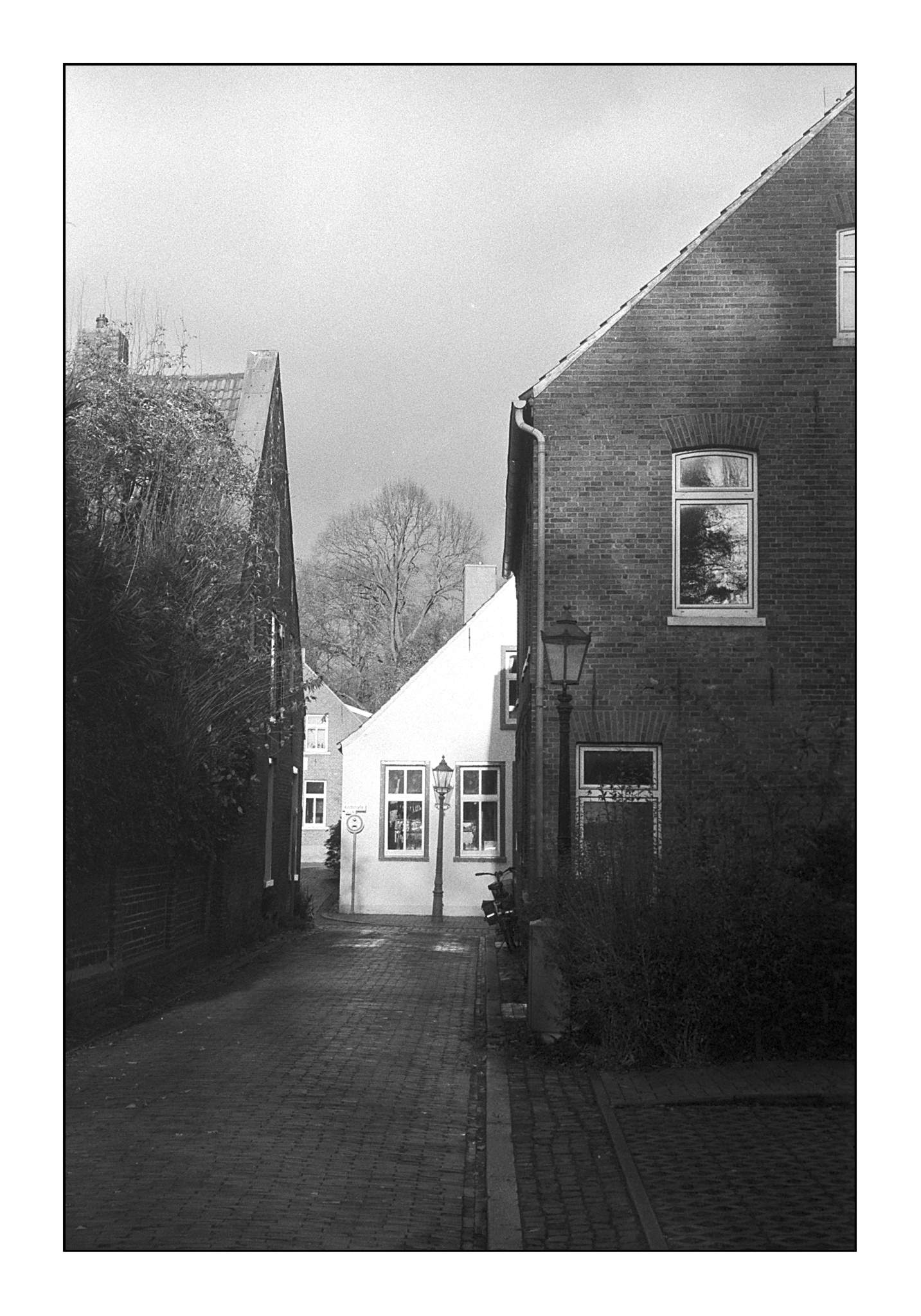 Was hat das jetzt aber mit Leer in der Vorweihnachtszeit zu tun? Vorweihnachtszeit erklärt sich einfach: dann sind die Ferienhäuser sehr günstig und die Nächte lang und die Kurzwellenbedingungen üblicherweise gut. Leer ist auch einfach erklärt. In den Nächten halt am Radio, aber tagsüber mache ich gerne Ausflüge und schaue mir Städte und Gegenden an, die ich auch – wie immer – mit meinen Kameras ablichte. Dieses Mal war es es Leer in Ostfriesland mit einem alten russischen Leica Nachbau, einer Zorki 4 von 1962. Man kann an der Kamera zwar das Objektiv austauschen, aber der Messsucher zeigt immer den gleichen Ausschnitt und man muss dann mit einem Aufstecksucher arbeiten, damit man den durch das Objektiv vorgegebenen Ausschnitt auch so sehen kann. Das ist mir zu kompliziert und da ich die 50mm Brennweite sowieso sehr schätze, passt das hervorragend. Die Kamera hat auch keinen Belichtungsmesser, also muss der externe kleine Gossen Digisix 2 oder ein „Schätzschieber“ in der Tasche sein, damit man die Bilder korrekt belichten kann.